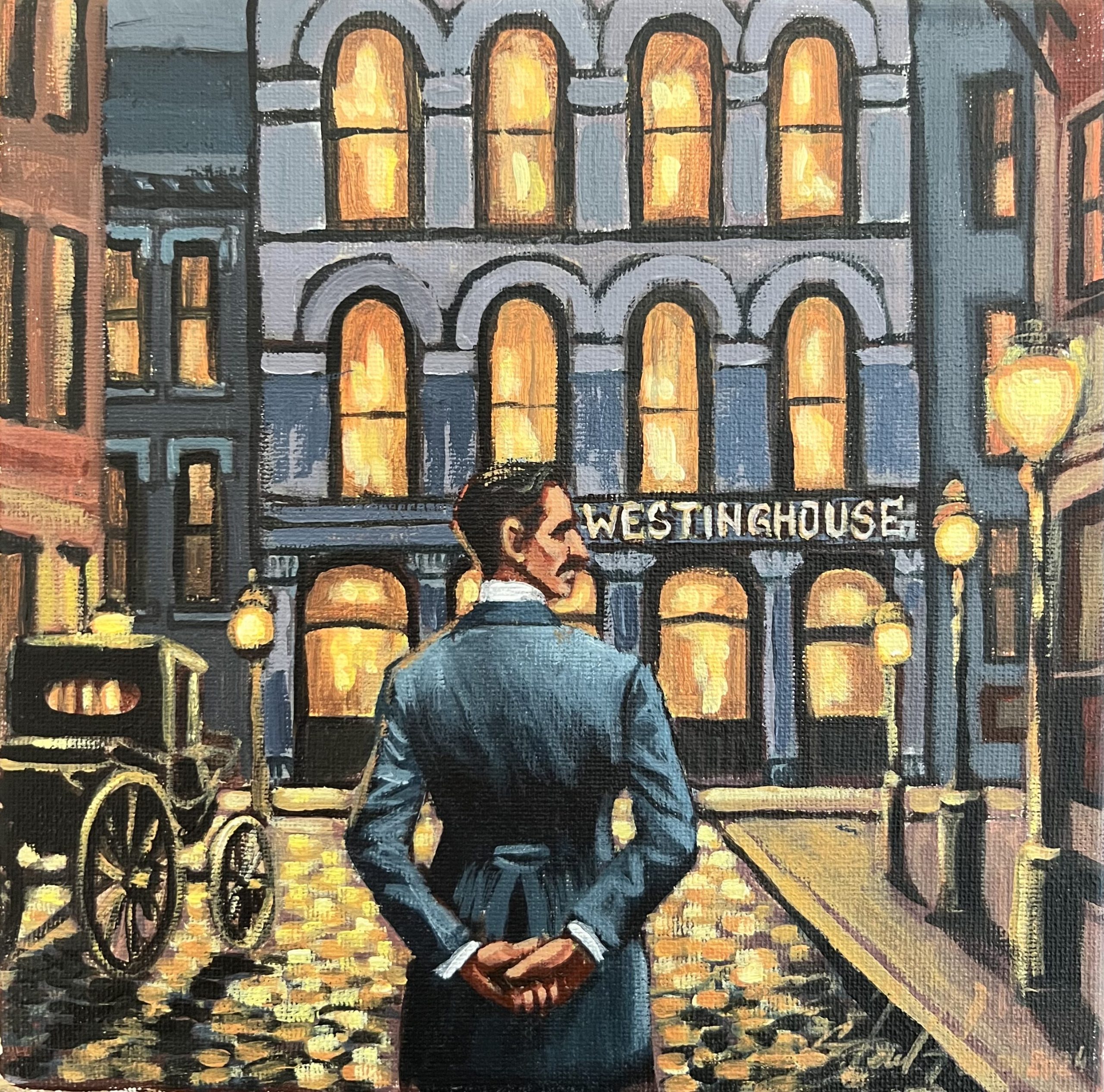 Tesla stands before Westinghouse. Calm, proud, finally heard.